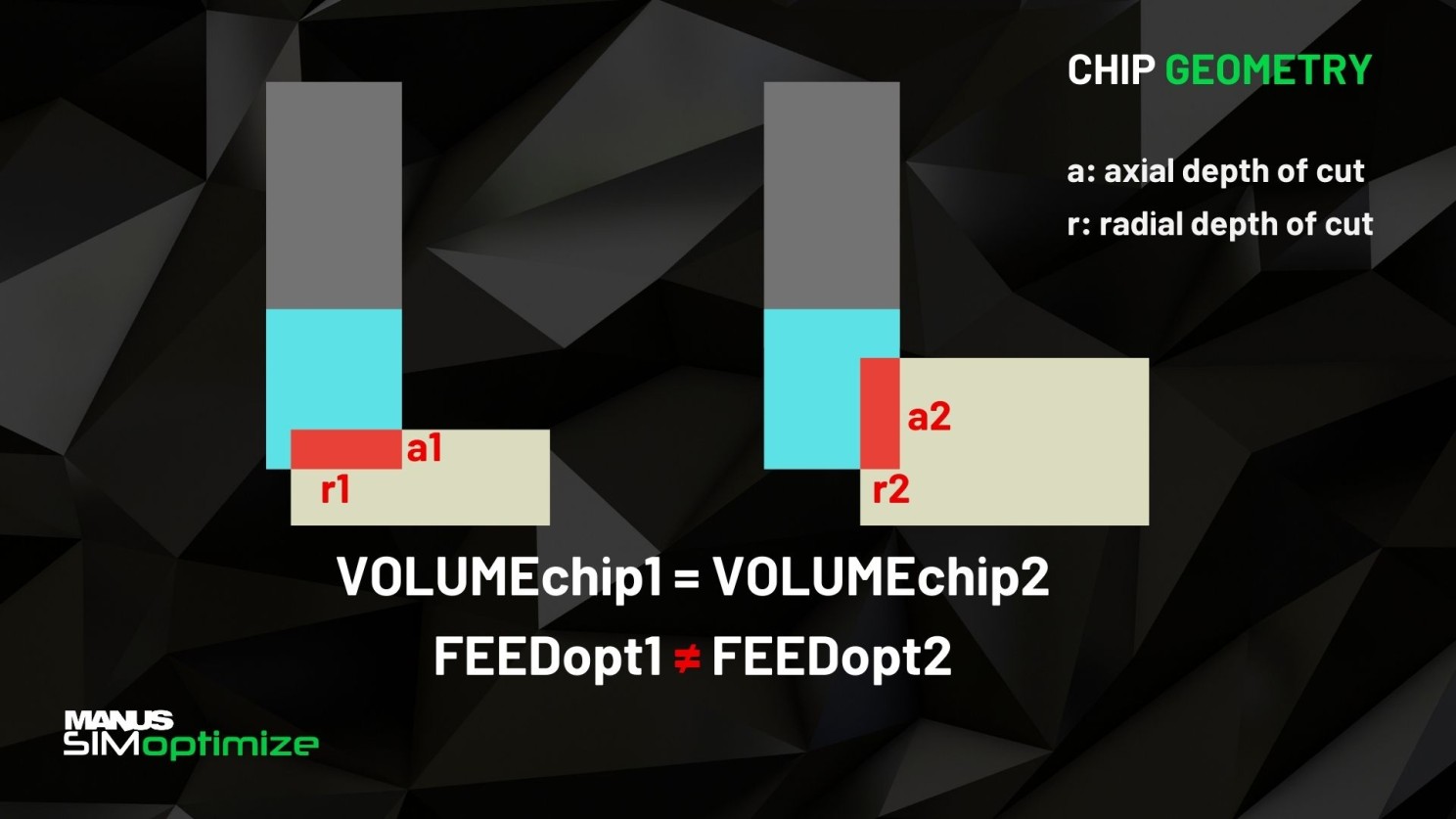 While chip volume is crucial, the real breakthrough lies in optimizing feed rates based on chip 3D geometry. Unlike volumetric-only approaches, MANUSsim Optimize factors in the axial and radial depths of cut, along with the unique chip geometries formed during machining. This enables precise, real-time adjustments for each cut, even when chip volumes are identical.