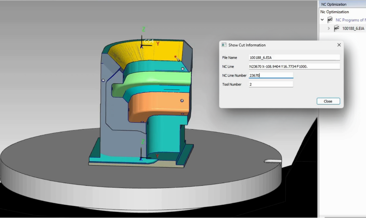 In MANUSsim, during your simulation, you have the option to pause at any moment and use the “Cutting Information” button to inspect cut surfaces. Clicking this button will open the “Show Cut Information” window, which provides detailed insights when you click on any cut surface. These insights include: NC File Name, NC Line, NC Line Number and the corresponding Tool Number responsible for the cut.