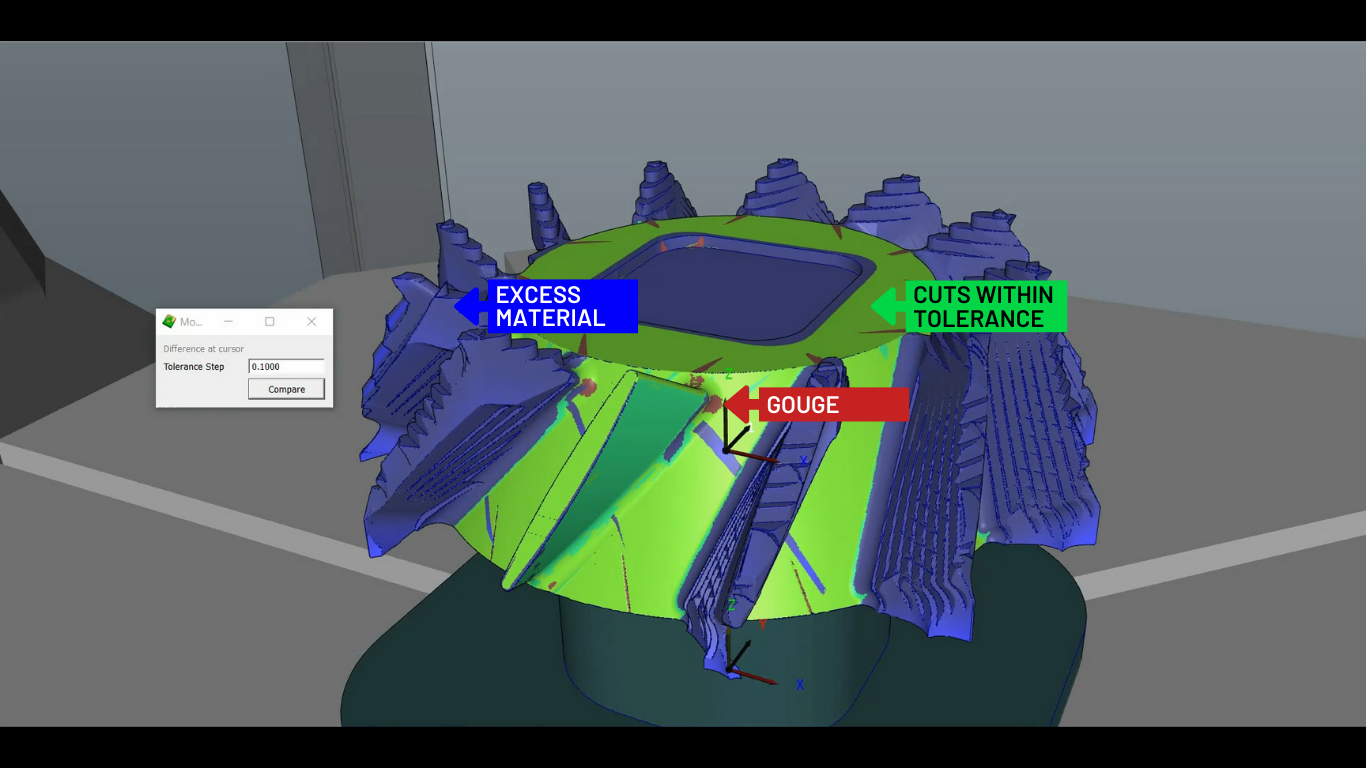 The Cut Stock – Model Comparison feature enables users to compare the cut stock to the original model in real time. This feature is useful for verifying the accuracy of the machining process by visually comparing the current state of the workpiece (cut stock) with the CAD model. It helps identify any deviations or errors that may have occurred during machining, ensuring that the final product matches the intended design specifications.